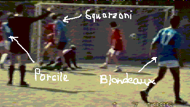 Azione seguente a fallo laterale. Batte Blondeaux (ID) per Squarzoni (ID) che, con le spalle alla porta, fa velo e permette a Porcile (ID) di trovare la via della rete.