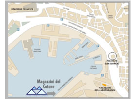 L'area Expo e il Cotone Congressi sono a dieci minuti di cammino. Attraversata la strada di fronte alla stazione, si scende verso via Pré. S'imbocca via Pré sul lato sinistro e si prosegue, sempre dritti, fino a Piazza Banchi (riconoscibile per la chiesa edificata sopra i negozi). Da Piazza Banchi si gira a destra e ci si trova di fronte all'area Expo. Da lì, seguire le indicazioni per "Magazzini del Cotone" (Cotone Congressi). In alternativa è possibile utilizzare la METRO dalla Stazione FS Genova Principe alla stazione di Caricamento/S.Giorgio. Per maggiori informazioni consultare il sito (http://www.amt.genova.it/ ; http://www.genovametro.com)